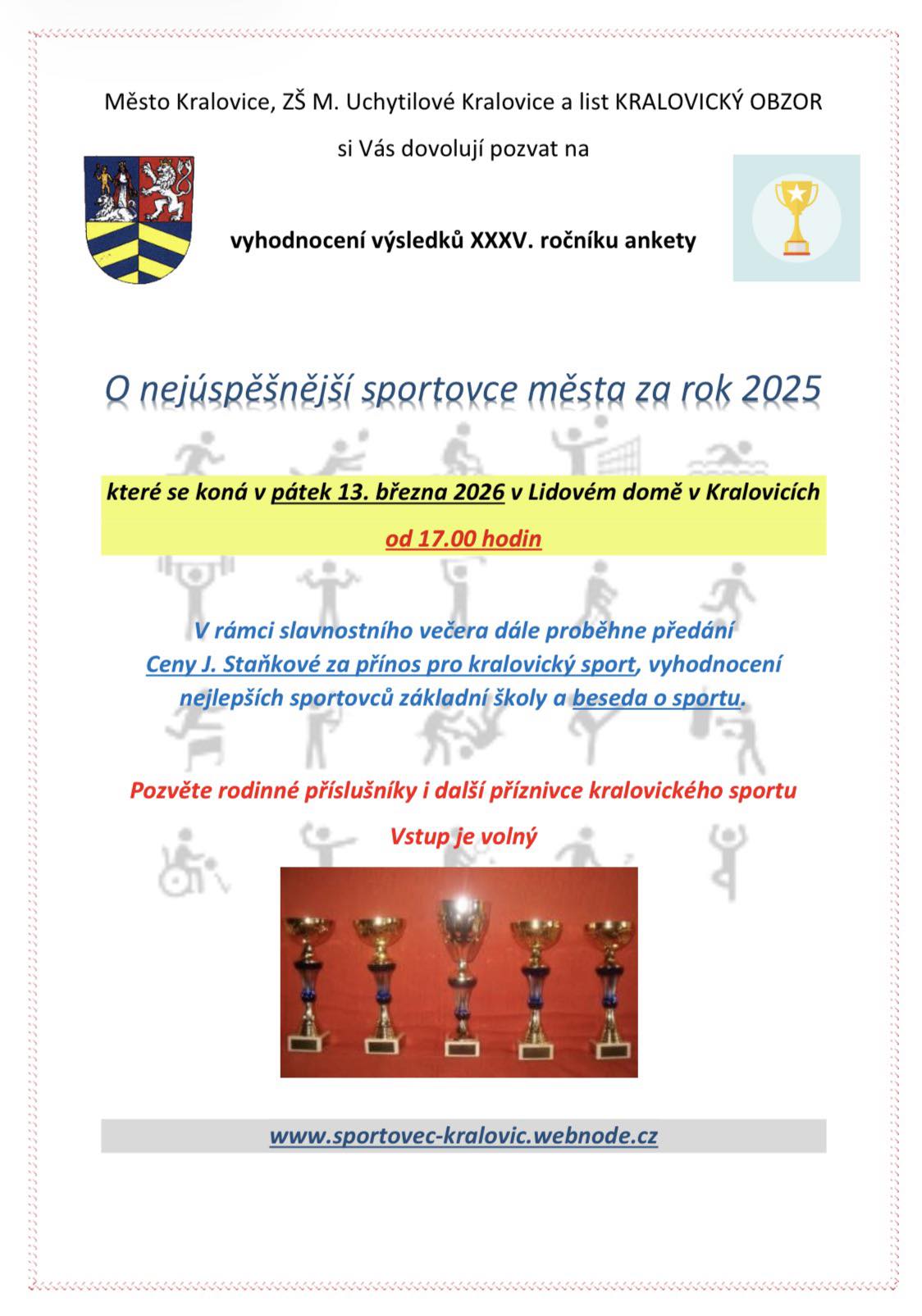 13.3.2026 17h - VYHLÁŠENÍ NEJLEPŠÍCH SPORTOVCŮ KRALOVIC - KD KRALOVICE